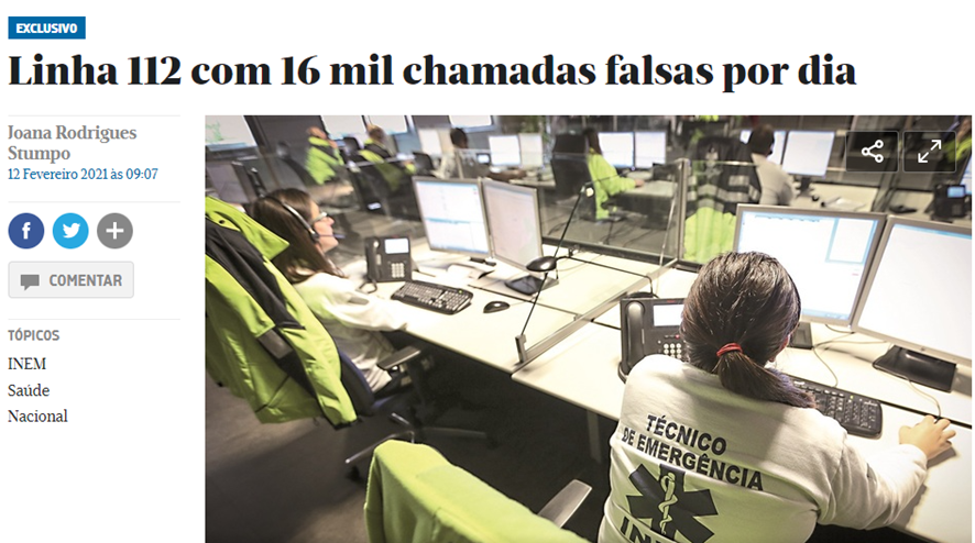Rodrigues Stumpo, J. (2021, 12 de fevereiro). Linha 112 com 16 mil chamadas falsas por dia. JN. https://www.jn.pt/nacional/linha-112-com-16-mil-chamadas-falsas-por-dia-13344480.html