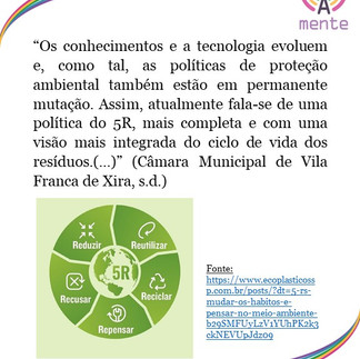 “Os conhecimentos e a tecnologia evoluem e, como tal, as políticas de proteção ambiental também estão em permanente mutação. Assim, atualmente fala-se de uma política do 5R, mais completa e com uma visão mais integrada do ciclo de vida dos resíduos.(…)” (Câmara Municipal de Vila Franca de Xira, s.d.)